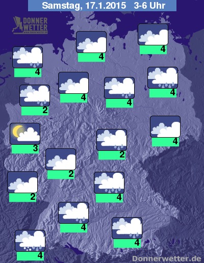 Am Samstag ist es zunächst verbreitet stark bewölkt oder bedeckt, dazu fällt insbesonders im Süden zum Teil langanhaltender Regen, Schneeregen oder Schnee, sonst fällt nur hier und da mal etwas Regen. Am Nachmittag lockert die Bewölkung von Nordwesten und Westen her auf und die Sonne kann sich häufiger zeigen, dazu bleibt es trocken. Die Höchstwerte erreichen 3 Grad am Spessart und bis 6 Grad in Ostfriesland.