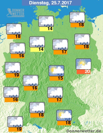 Am Dienstag bleibt es verbreitet stark bewölkt und es fällt immer wieder, häufig auch starker, gewittriger und ergiebiger Regen, etwas Sonnenschein ist im Südosten und Sachsen, hier bleibt es auch zumeist trocken. Die Temperatur steigt auf nur 14 Grad an der oberen Weser und bis 20 Grad in der Lausitz.