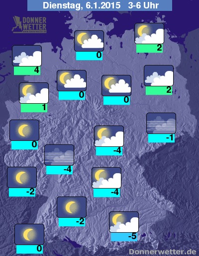 In der kommenden Nacht bleibt es in der Südhälfte, sowie auch im Westen des Landes oft sternenklar, gebietsweise ziehen aber auch einige Wolken auf und stellenweise bildet sich Nebel, dabei bleibt es aber trocken. Im Norden und Osten ist es meist aufgelockert oder stark bewölkt, dazu bleibt es jedoch zumeist trocken. Die Temperatur sinkt auf 4 Grad in Emden und bis -5 Grad in München.