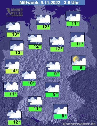 In der folgenden Nacht ziehen von Südwesten her dichte Wolken mit zeitweiligem Regen durch, dazwischen kann es bei Regenpausen stellenweise auch etwas auflockern. Im Südosten und äußeren Osten bleibt es weitgehend trocken. Die Temperatur sinkt auf 14 Grad in Köln und 8 Grad in München. An der Nordsee weht der Wind oft stürmisch.