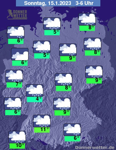 Am Sonntag zieht oft starke, teils auch aufgelockerte Bewölkung durch, dabei bilden sich gebietsweise Schauer, die zum Teil auch als Schnee oder Schneeregen niedergehen. Die Temperatur erreicht 6 Grad in Cuxhaven und bis 11 Grad in Stuttgart. Vor allem im Norden weht ein stürmischer Wind, an der See und auf den Bergen herrscht teilweise schwerer Sturm.