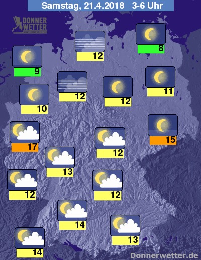 In der Nacht zum Samstag ist es vor allem über dem Norden weitgehend sternenklar, im übrigen Bundesgebiet ziehen auch oft lockere Wolkenfelder durch, dazu bleibt es trocken. Die Temperatur sinkt auf sehr milde 17 Grad in Köln und bis 8 Grad in Rostock.