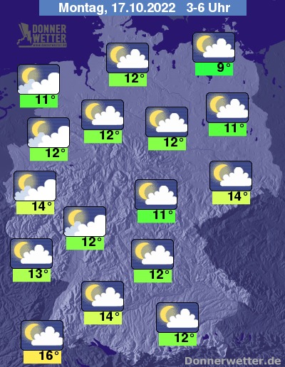 In der folgenden Nacht zeigt sich der Himmel überwiegend locker oder wechselnd bewölkt, zum Teil bildet sich auch mal eine dichte Wolkendecke aus. Es bleibt jedoch trocken bei 16 Grad am Oberrhein und 9 Grad an der Müritz.
