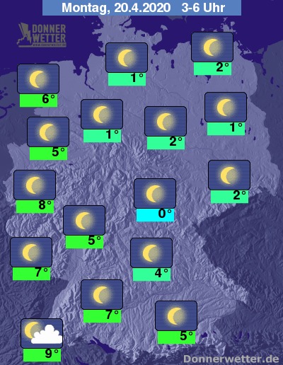 In der folgenden Nacht zeigt sich der Himmel über Deutschland weitestgehend sternenklar, dazu bleibt es trocken. Die Temperatur sinkt auf 9 Grad im Oberrheingraben und bis auf 0 Grad im Grabfeld.
