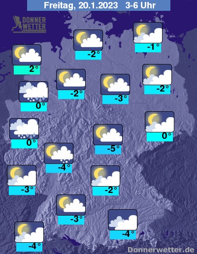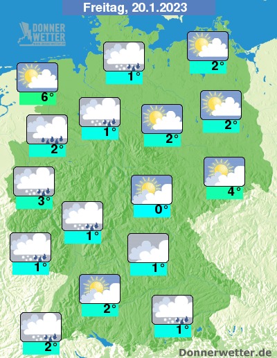 Am Freitag zeigt sich über dem Nordosten und auch über dem Osten häufiger die Sonne, hier bleibt es weitgehend trocken. Im übrigen Land dominieren dagegen viele und verbreitet auch dichte Wolken, dabei fällt gebietsweise Schnee oder Schneeregen, entlang von Rhein und Ems auch zum Teil Regen. Die Temperatur steigt auf 0 Grad im Eichsfeld und bis 6 Grad im nördlichen Emsland.
