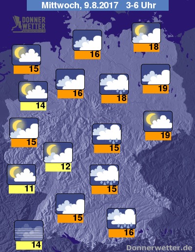In der kommenden Nacht bleibt es über der Osthälfte Deutschlands noch meist stark bewölkt und dazu fällt hier auch vielerorts, teils auch starker und gewittriger Regen. In den westlichen Landesteilen lockert die Bewölkung meist etwas auf, oft bleibt es auch noch stark bewölkt, dazu jedoch weitgehend trocken. Die Temperatur sinkt auf 19 Grad in Berlin und bis 11 Grad am Pfälzer Wald.