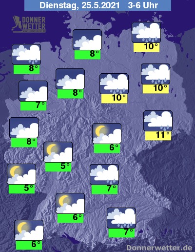 In der kommenden Nacht ist es über dem Bundesgebiet zum Großteil stark bewölkt, hin und wieder lockert es etwas auf. Es bilden sich gebietsweise Schauer bei Tiefstwerten von 11 Grad in Dresden und bis 5 Grad in Saarbrücken.
