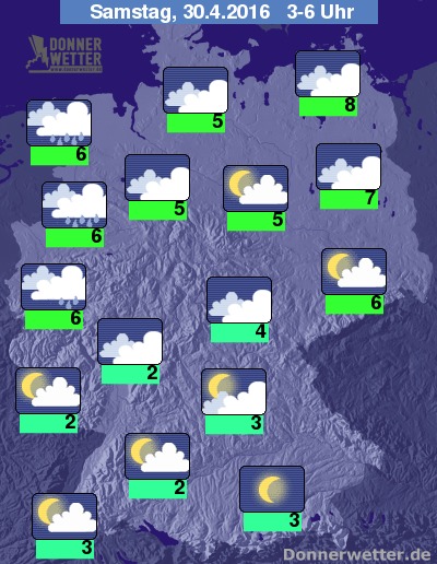 Am Samstag ist es im Südosten und anfangs auch im Osten oft heiter bis sonnig und dazu trocken, im großen Rest der Republik ist es dagegen verbreitet schon stark bewölkt, dabei fällt zunächst vom Rheinland bis nach Schleswig-Holstein zeitweise Regen, sonst ist es noch meist trocken. Am Nachmittag bilden sich dann verbreitet Schauer und vereinzelt auch Gewitter, im Osten und Südosten bleibt es hingegen meist trocken. Die Temperatur steigt auf teils nur 10 Grad im nördlichen Emsland und bis 19 Grad in der Lausitz.