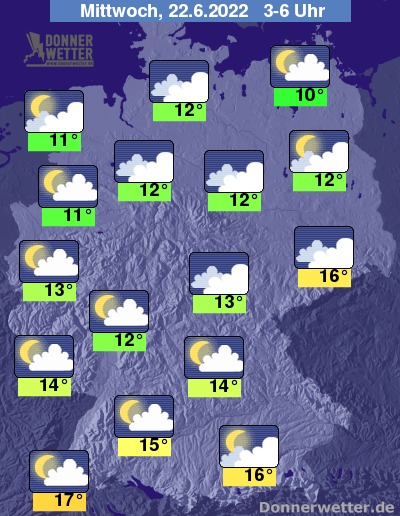 In der folgenden Nacht ist der Himmel teils locker, häufig aber auch stark bewölkt, dazu bleibt es weitgehend trocken. Die Temperatur sinkt auf 17 Grad am Oberrhein und 10 Grad an der Müritz.
