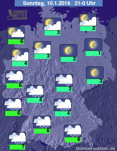 Heute Abend zieht von Südwesten her neuer Regen herein, der sich bis Mitternacht etwa bis zu einer Linie südliches NRW bis rüber zum Thüringer Wald hin ausbreitet. Weiter nach Norden hin ist es meist locker bewölkt oder sternenklar, gebietsweise ziehen aber auch mehr Wolken durch, dazu bleibt es jedoch trocken. Die Abendtemperatur liegt bei 7 Grad im Oberrheingraben und etwa 1 Grad an der polnischen Grenze.