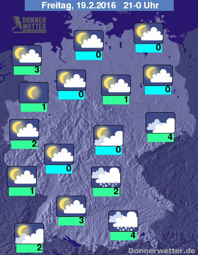 Am Abend und in der Nacht zeigt sich der Himmel im Norden Deutschlands überwiegend locker bewölkt, entlang der Ems auch stellenweise klar. Im Süden bleibt es zunächst teils dichter Bewölkung oder bedecktem Himmel sowie vereinzeltem Regen-, Schnee- oder Schneeregenfall. Auflockerungen sind vor allem im Südwesten in der ersten Nachthälfte möglich.