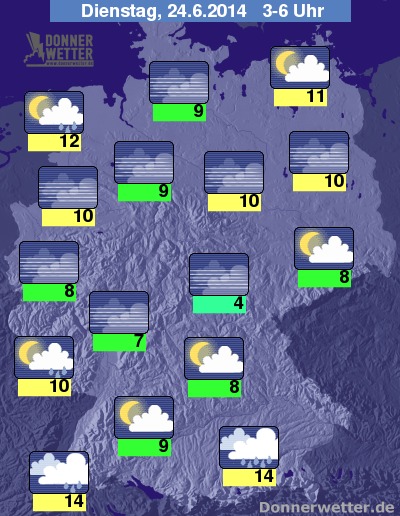 In der kommenden Nacht fällt im äußern Norden und Süden bei häufig dichtere Bewölkung zeitweise Regen, sonst ist es verbreitet aufgelockert bewölkt, zum Teil auch klar und es bleibt trocken. gebietsweise ist es neblig-trüb. Die Tiefstwerte erreichen 14 Grad in Freiburg und 4 Grad am Elstergebirge.