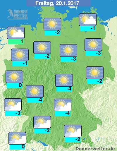 Die Temperaturen erreichen am Tag Höchstwerte um -5 Grad C im Thüringer Wald und um 2 Grad C in Ostfriesland.