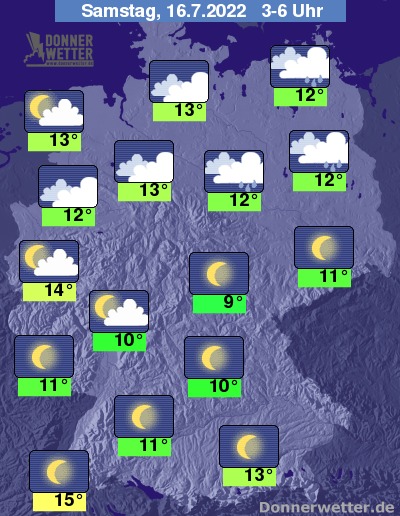 In der Nacht zum Samstag ziehen im Norden dichte Wolken durch und es bilden sich hier gebietsweise Schauer. Über der Südhälfte der Republik hin zeigt sich der Himmel dagegen meist sternenklar. Im übrigen Land ist es teils stark, teils aufgelockert bewölkt und dazu trocken. Die Temperatur sinkt auf 15 Grad in Freiburg und 9 Grad in Jena.