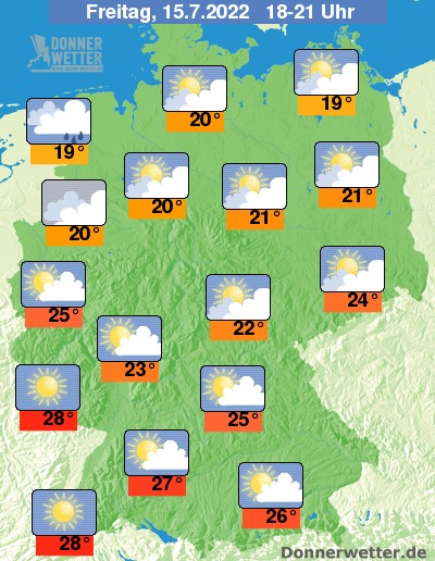 Heute Abend ist es über dem Süden und Westen heiter oder sonnig und trocken. Über der Nordosthälfte ziehen hingegen oft viele und teils dichte Wolken hinweg. Einzelne Schauer sind in Nordseenähe möglich, sonst bleibt es trocken. Die Temperatur liegt bei 19 Grad an der See und bis 28 Grad im Oberrheingraben.