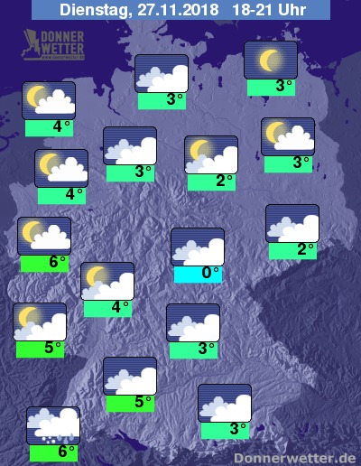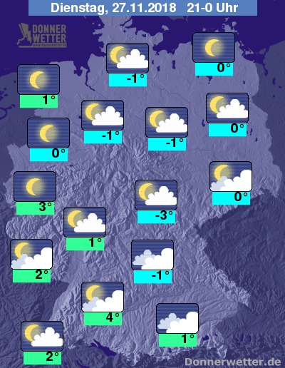 Bis Mitternacht lässt der Niederschlag ganz im Süden nach, im übrigen Land klart der Himmel gebietsweise auf und die Temperaturen sinken teilweise in den Frostbereich. Es muss örtlich mit Glätte durch überfrierender Nässe gerechnet werden.