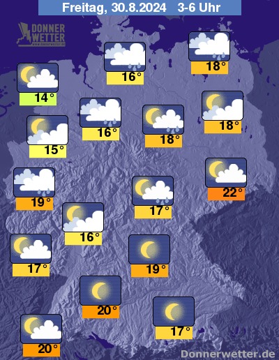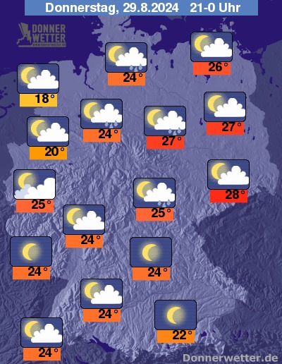 Am Abend und in der Nacht zum Freitag breiten sich dichte Wolken von Westen her nordostwärts aus. Auf einer Linie von der Eifel bis in die Mecklenburgische Schweiz muss dabei mit teils schauerartigem Regen gerechnet werden, auch lokale Gewitter können nicht ausgeschlossen werden. Im Nordwesten, Süden und Südosten bleibt es bei geringer Bewölkung oder sternenklarem Himmel niederschlagsfrei.