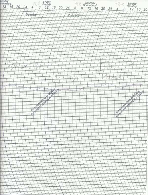 Der Schrieb zeigt den Luftdruckverlauf zwischen Donnerstag und Sonntag vergangener Woche an unserer Wetterstation in Bonn: