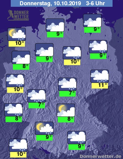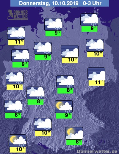In der Nacht zeigt sich der Himmel über weiten Teilen des Landes dicht bewölkt oder bedeckt, im Südosten, dem Schwarzwald sowie an der Nordseeküste ist es zeitweise auch locker oder aufgelockert bewölkt. Verbreitet muss in der Nacht mit Schauern gerechnet werden.