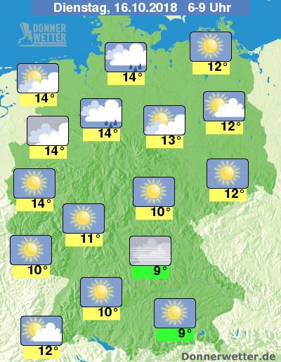 Der Dienstag startet im  Norden dann häufig wechselnd oder stark bewölkt mit einzelnen Schauern zwischen der Holsteinischen Schweiz und des Teutoburger Walds, in den übrigen Landesteilen bleibt der Himmel zumeist wolkenlos. Vor allem im Südosten kann sich stellenweise Nebel bilden.