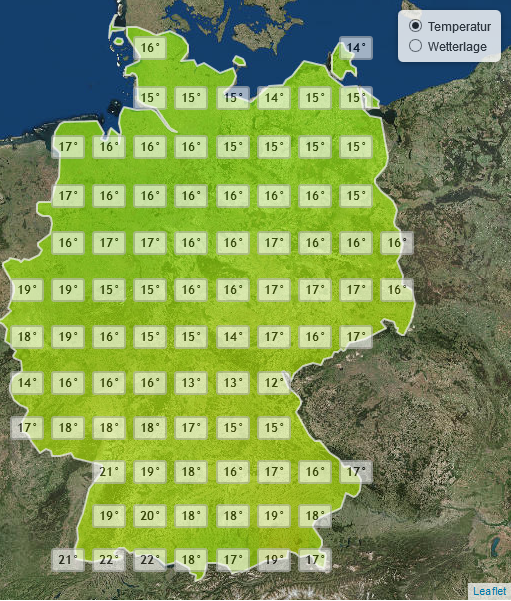 Dies bleibt bis morgen stabil, im Südwesten wird es neblig. Am Abend ist es dann im Norden noch deutlich kälter als im Süden, das zeigen 14 Grad in Flensburg und 19 in München. Die kälteste Orte Deutschlands heißen heute Nacht Bayreuth und Berchtesgaden, wo die Temperaturen Tiefstwerte von 6 bis 7 Grad annehmen. Am wärmsten ist es dagegen mit konstanten 12 Grad auf Rügen.