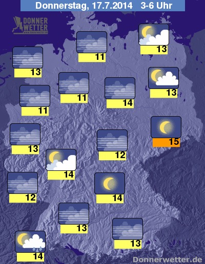 In der kommenden Nacht bleibt es bei vielfach klarem Himmel überall trocken, jedoch kann sich gebietsweise Nebel oder Hochnebel bilden. Die Temperatur sinkt auf 15 Grad in Dresden und etwa 11 Grad in der Norddeutschen Tiefebene.