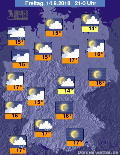 Am frühen Abend ist es teils heiter, teils wolkig. Südlich des Mains können noch örtliche Regengüsse nieder gehen. Sonst bleibt es in der Regel niederschlagsfrei. Im Nordseeumfeld trübt sich der Himmel bei auffrischendem Südwestwind allmählich ein. Vor Sonnenuntergang bewegen sich die Temperaturen bei noch recht angenehmen 18 bis 23 Grad. Der Wind