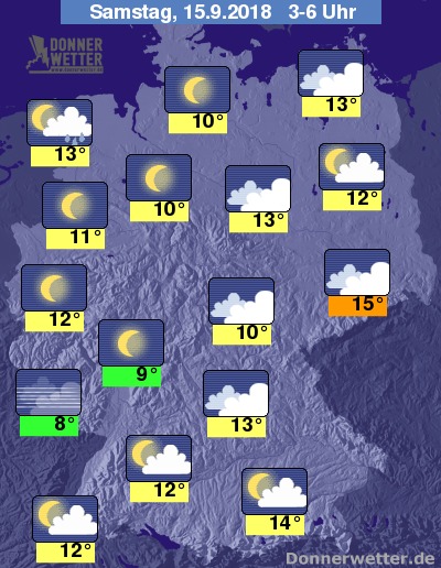 In der zweiten Nachhälfte kann es bei lebhaftem Südwestwind auf den Nordseeinseln und im nördlichen Schleswig-Holstein zu Schauern kommen. Sonst funkeln teilweise die Sterne oder es ziehen lockere Wolkenfelder übers Land. Stellenweise bilden sich Nebelfelder. Dies betrifft vor allem die Gebiete an Mosel, Saar und Nahe. Zu den Frühstunden kühlt sich die Luft auf 8 bis 13 Grad ab. In einigen Mittelgebirgstälern wird es noch etwas kühler. In Sachsen, sowie rund um München bleibt es dagegen etwas milder.