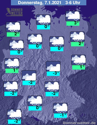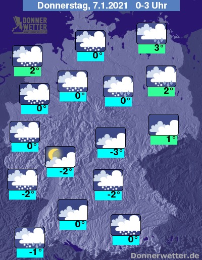 In der Nacht bleibt der Himmel bis auf seltene Auflockerungen im Rhein-Main-Gebiet bedeckt, dabei muss verbreitet mit Schneeregen- und Schneeschauern, im norddeutschen Tiefland teils auch Regenschauern gerechnet werden. Längere trockene Phasen beschränken sich vom Hunsrück bis in die Lausitz.