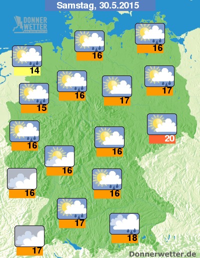 Am Samstag ist es zwar häufig aufgelockert bewölkt, es ziehen jedoch auch immer wieder dichte Wolken durch, die für Schauer und vor allem im Norden und am Alpenrand auch einzelne Gewitter sorgen können. Besonders über der breiten Mitte des Landes ist es aber auch längere Zeit trocken und die Sonne kann sich gebietsweise auch häufig zeigen. Die Temperatur steigt auf 14 Grad an der Nordsee und etwa 20 Grad in Dresden.