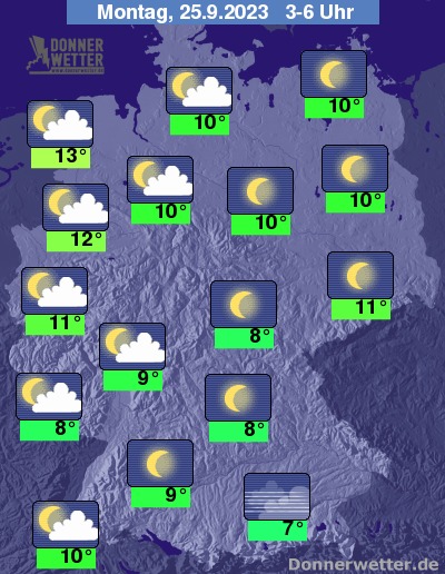 In der folgenden Nacht zeigt sich der Himmel überwiegend sternenklar. Im Norden und Westen ziehen jedoch zeitweise auch einige, meist lockere Wolken durch. Es bleibt trocken bei Tiefstwerten von 13 Grad in Bremerhaven und 7 Grad in Augsburg.