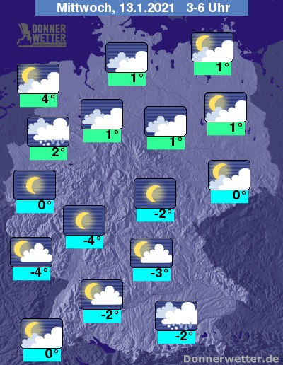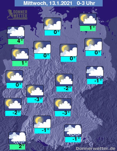 In der Nacht zeigt sich der Himmel über dem norddeutschen Tiefland zunächst noch wechselnd bewölkt, im weiteren Verlauf verdichten sich die Wolken dann hier wieder verbreitet. Einzelne Schauer begrenzen sich auf das Nordseeküstenumfeld. In der Mitte und im Süden des Landes überwiegt in den Nachtstunden ein Mix aus lockerer Bewölkung und sternenklarem Himmel. Bis auf einzelne Schneeregen- oder Schneeschauer bleibt es meist trocken. Es weht ein frischer bis stürmischer Wind, an den Küsten und auf den Gipfeln auch Sturmböen.