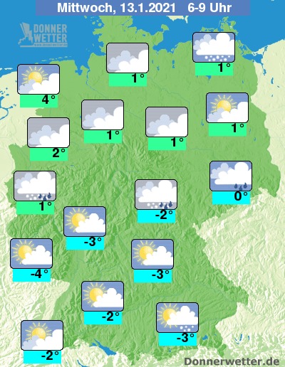 Die Wochenmitte startet über der Nordhälfte mit einer meist geschlossenen Wolkendecke, aus der vor allem an der Ostseeküste auch einzelne Schneeregen- oder Schneeschauer fallen können. Südlich des Mains wechseln sich Sonne und Wolken in den Frühstunden ab und es bleibt meist trocken.