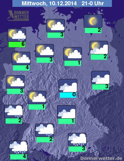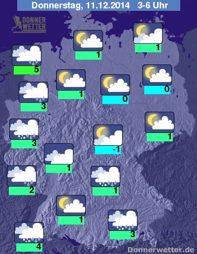 In der Nacht zum Donnerstag fällt südlich des Mains weiterhin gelegentlich Schnee, Schneeregen oder Regen, sonst ist es zunächst verbreitet locker oder aufgelockert bewölkt und trocken. Gegen Morgen ziehen aus Westen jedoch erneut dichte Wolken mit Regen oder Schneeregen auf. Dabei kann es stellenweise glatt auf den Straßen werden. Im Norden und Westen weht meist frischer, teils starker, an der Küste zeitweise starker bis stürmischer und in Böen auch orkanartiger Wind. Die Temperatur sinkt auf 5 Grad am Dollart und etwa -1 Grad im Frankenwald.