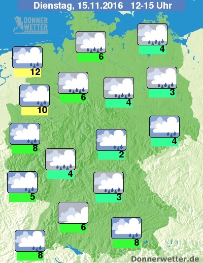 Heute Nachmittag zeigt sich das Wetter über der Bundesrepublik verbreitet grau in grau und es zeigen sich nur sehr selten einzelne Auflockerungen, stattdessen fällt immer wieder Regen, im Südosten und Osten hier und da auch Schneeregen. Die Temperatur liegt bei nasskalten 2 Grad am Thüringer Schiefergebirge und etwa 12 Grad im Emsland.