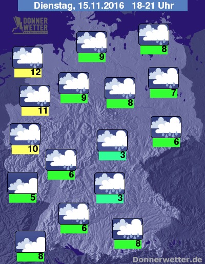 Heute Abend bleibt es landesweit stark bewölkt und es fällt verbreitet Regen. Die Temperatur liegt bei etwa 3 Grad in Mittelfranken und bis 12 Grad am Niederrhein.
