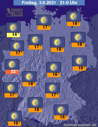 Die Temperaturen liegen am Abend zunächst noch bei Werten um 19 Grad an der Nordseeküste und 28 Grad in Köln; später Temperaturabnahme auf Werte um 22 bis 17 Grad. Etwas kühler bleibt es in der ersten Nächthälfte im Umfeld der Küsten.