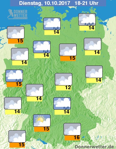 Heute Abend ziehen verbreitet dichte Wolken übers Land hinweg, Auflockerungen sind hier und da, vor allem allem jedoch im Süden möglich. Im Norden und Nordosten bilden sich zeitweise Schauer, sonst bleibt es bis auf seltene Schauer trocken. Die Temperatur liegt bei 12 Grad im Thüringer Becken und bis 16 Grad in München.