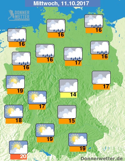 Am Mittwoch setzt sich im Süden und im weiteren Verlauf auch im Westen heiteres und trockenes Herbstwetter durch. Im übrigen Land bleibt es jedoch noch verbreitet stark bewölkt und es fällt vor allem im Norden auch zeitweise Regen. Die Temperatur erreicht 14 Grad im Grabfeld und bis 20 Grad im Breisgau.