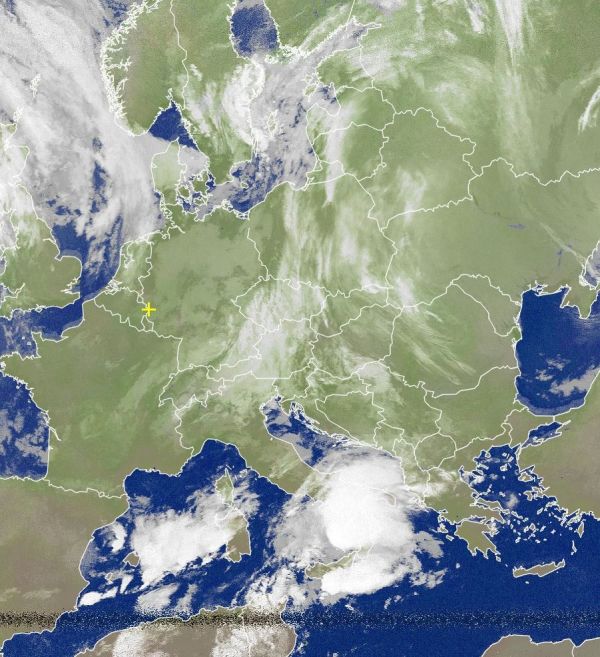 Auf dem aktuellen Satellitenbild zeigen sich große Teil von Südwest- über West- bis nach Mitteleuropa aufgelockert bewölkt, vor allem über Westeuropa auch vielfach heiter. Die dichten Wolken, die heute früh noch über Süditalien lagen, ziehen derweil weiter Richtung Ägäis bzw. ins östliche Mittelmeer.