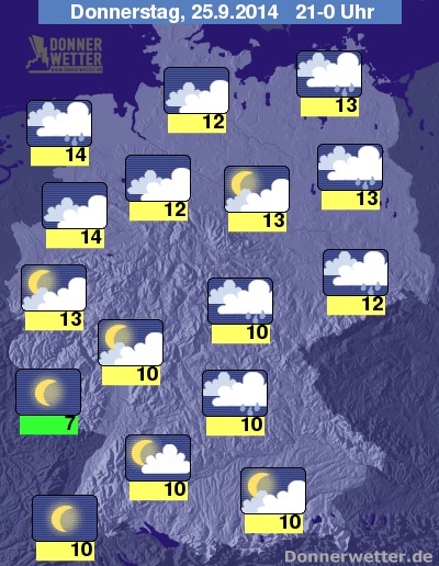 Am Abend ziehen vor allem im Norden und Osten vielfach dichte Wolken durch, und bringen zeitweiligen Regen, aber auch in der Mitte des Landes kann es bei teils dichten Wolken gebietsweise leichten Regen geben. Weiter nach Süden und Westen lockern die Wolken dagegen meist auf und es bleibt weitgehend trocken. Vor allem im Südwesten ist es zeitweise auch klar. Die Abendtemperatur liegt bei 14 Grad in Osnabrück und etwa 7 Grad am Pfälzer Wald.