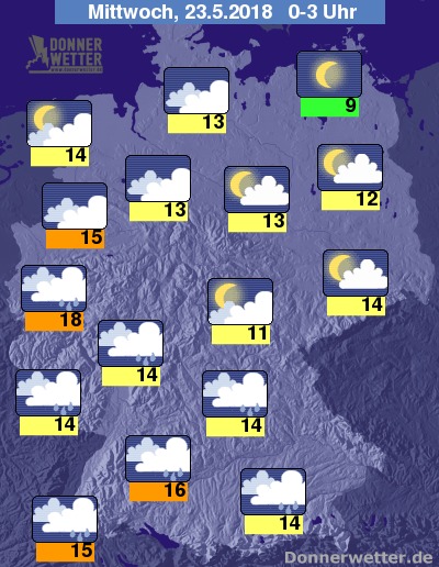 In der Nacht ist der Himmel häufig stark bewölkt oder bedeckt, in der Südhälfte muss zudem flächendeckend mit Schauern gerechnet werden. Lockere Bewölkung bestimmt in der Osthälfte das Himmelsbild, an der Ostseeküste ist es auch sternenklar.