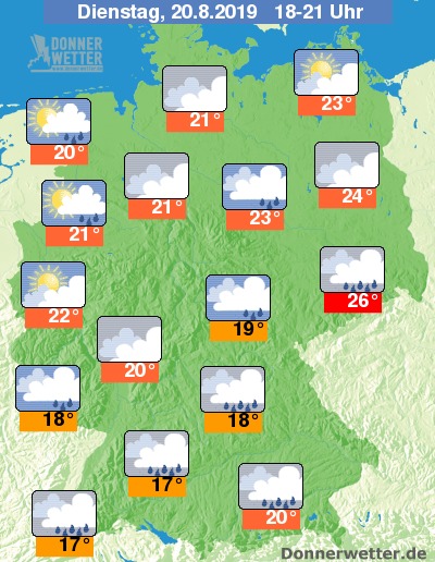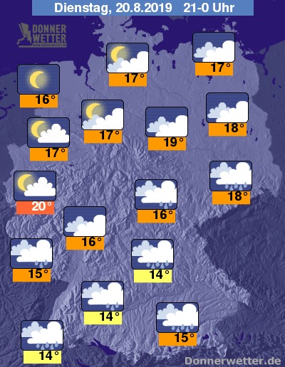 Am Abend bleibt der Himmel über weiten Teilen Deutschlands stark bewölkt oder bedeckt, einzelne Auflockerungen sind meist nur an den Küsten sowie im Westen des Landes zu erwarten. Im Norden ziehen einzelne Niederschläge bis zum späten Abend ab, im Süden muss dagegen immer wieder mit teils kräftigem Regen gerechnet werden.