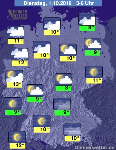 In der Nacht auf Dienstag ist es in der Nordhälfte des Landes überwiegend starkt bedeckt und im Nordwesten regnet es. In der Südhälfte bleibt es trocken und klar. Die Temperaturen sinken auf 13 Grad in Düsseldorf und 8 Grad im Thüringer Bergwald.