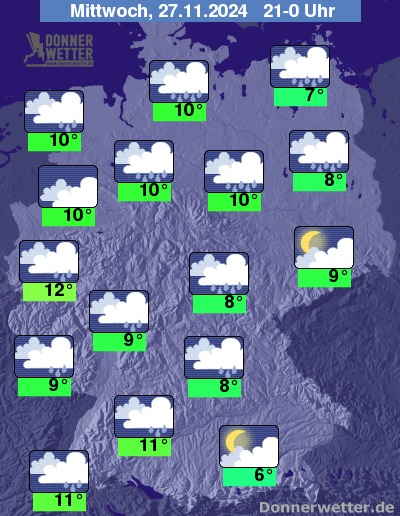 In der Nacht zum Donnerstag zeigt sich der Himmel über weiten Landesteilen stark bewölkt oder bedeckt, dabei breitet sich teils kräftiger Regen auch über die Süd- und Osthälfte aus. Die Schneefallgrenze sinkt auf 600 bis 800 Meter. Von Westen her lassen die Niederschläge im Nachtverlauf nach und es lockert gebietsweise auf.