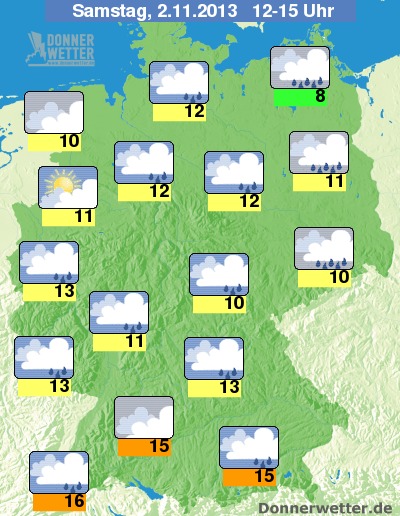 Die Tiefs 'Erol' und 'Friedrich' sorgen am Wochenende für Wind, Regen, Wolken und sinkende Temperaturen. Am Samstag regnet es zeitweise, nur noch im Süden werden Werte um 15 Grad erreicht. Meist liegen die Temperaturen um 11 bis 13 Grad, im Nordosten sogar teilweise nur 8 Grad. In den Höhenlagen der Mittelgebirge sind Sturmböen, teilweise auch schwere Sturmböen möglich.