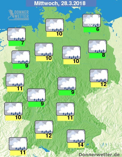 Am Mittwoch ziehen verbreitet dichte Wolken übers Land, dabei fällt immer wieder, zum Teil auch langanhaltender Regen. Die Temperatur erreicht 6 Grad in Vorpommern und bis 14 Grad in München.