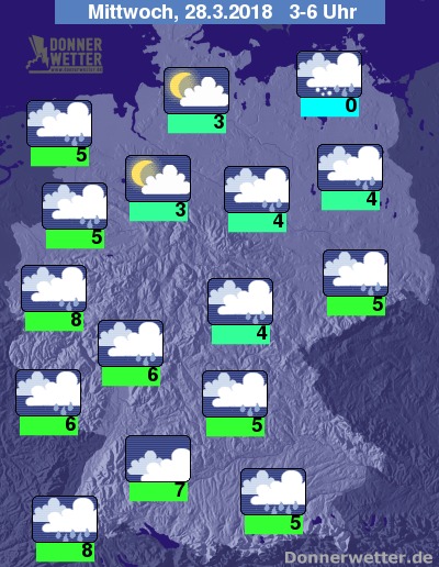 In der Nacht zum Mittwoch ziehen verbreitet dichte Wolken durch, dabei fällt auch wiederholt Regen, im Nordosten zum Teil sogar Schneeregen oder Schnee. Kurze Auflockerungen sind dennoch möglich. Die Temperatur sinkt auf 8 Grad in der Rheinschiene bis 0 Grad an der Müritz.