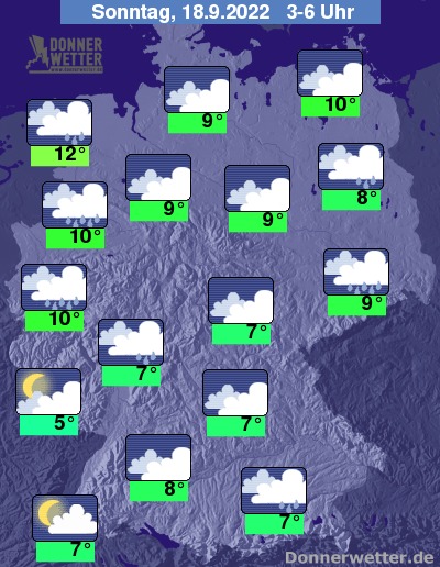 In der folgenden Nacht ist es vor allem im Süden zeitweise aufgelockert bewölkt, ansonsten ziehen von Nordwesten her jedoch überwiegend dichte Wolken durch und es bilden sich vielerorts Schauer. Die Temperatur sinkt auf 12 Grad an der Nordsee und bis 5 Grad im Saargau. An der Nordsee weht ein oft stürmischer Wind.
