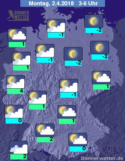 In der Nacht zum Montag fällt über dem Osten anfangs noch Schnee, über dem Süden zunächst zeitweise Regen, sonst ist es bereits meist locker oder aufgelockert bewölkt und trocken. Gegen Morgen fällt nur noch im Alpenvorland zeitweise Regen oder Schnee, sonst ist es bei teils klarem, teils locker bis aufgelockertem Himmel trocken. Die Temperatur sinkt auf 2 Grad in Freiburg und bis -3 Grad im Grabfeld.